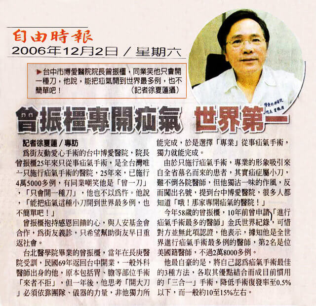 為街友動愛心手術的台中博愛醫院,院長曾振橿30年來只從事疝氣專科手術,是全台灣唯一只施行疝氣手術的醫院。由於只施行疝氣手術,專業的形象吸引來自全省慕名而來的患者。為了將復發率、疼痛及住院天數降到最低,曾醫師從長年治療疝氣的經驗中,反覆比較各種疝氣手術方式,取其優點精隨,發展出曾式疝氣修補法,同時追蹤手術後兩年病患,降低手術復發率至0.5%以下,住院時間縮短至5~24小時,因此成為國際醫學期刊認可刊登,是一種最新的自體組織修補法。曾式疝氣修補術手術時間僅需20-30分鐘左右,可使患者更快恢復正常健康的生活。